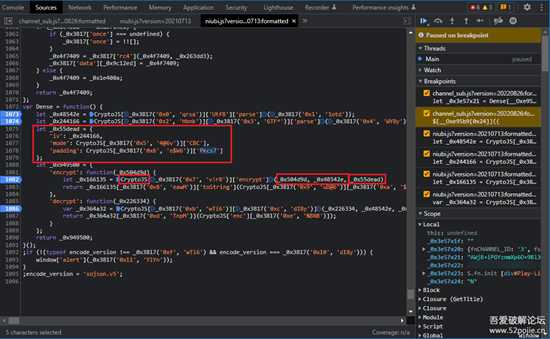 payload 和返回数据均被加密,看一下调用,最后调用的俩应该是发送请求的,channel_sub 这个 js 看名字有点料,下几个断点,F5: