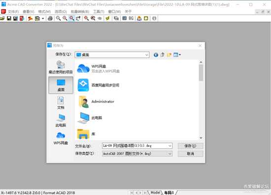 同时转换操作也极为简单,用acme打开高版本图纸,然后另存为图纸即可。