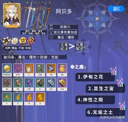 阿贝多伤害跟防御力挂钩,刚好可以弥补平时刷出双爆防御沙或者副词条的,被你当做辣鸡的,刚好阿贝多用得上,也就不浪费了。