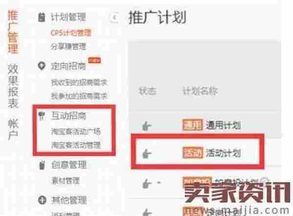 淘宝客活动广场在后台左侧互动招商那里。淘客活动分为计划推广和活动推广两种。计划推广:我们自己找淘客平台报名活动。活动推广:阿里妈妈帮你找淘客搭建平台推广。