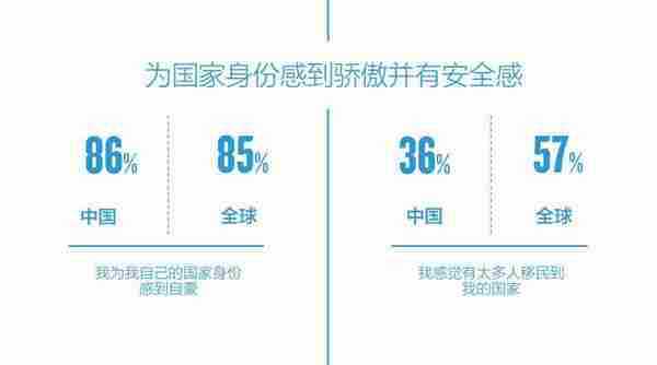 34%的中国受访者对“中国制造”的质量更有信心,相对的全球数据仅为16%86%的中国受访者为本土文化与国家身份感到自豪,高于全球平均水平